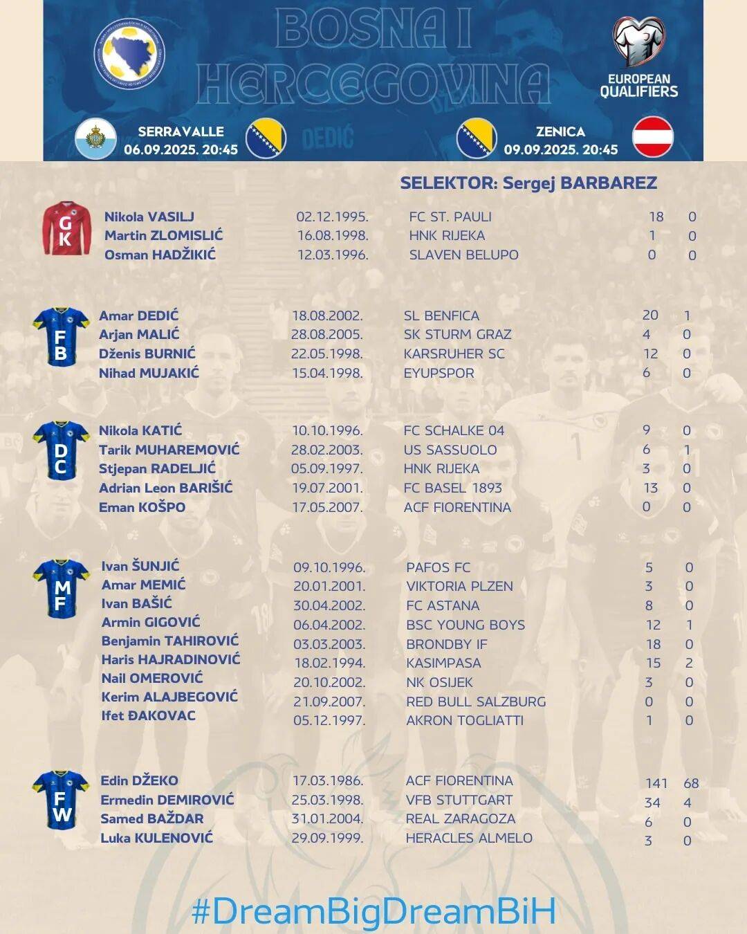 波黑主帅巴巴雷茨承认上周的比赛有所保留,他的目标是击败奥地利争夺小组第一。由于伤病影响,亚特兰大后卫Sead Kolasinac缺席大名单,前霍芬海姆后卫Ermin Bicakcic没有找到新球队落选,安塔利亚体育中卫萨里奇因转会事宜缺席。波黑本次第一次招入了出生于德国的Kerim Alajbegovic,今年只有17岁的他第一次代表波黑出场就制造了圣马力诺红牌并打入一球,赛后梅开二度的哲科戏言他为波黑打进处子球时Kerim Alajbegovic还未出生。里耶卡中卫Stjepan Radeljic和赫拉克勒斯前锋库列洛维奇被排除在今天大名单之外。