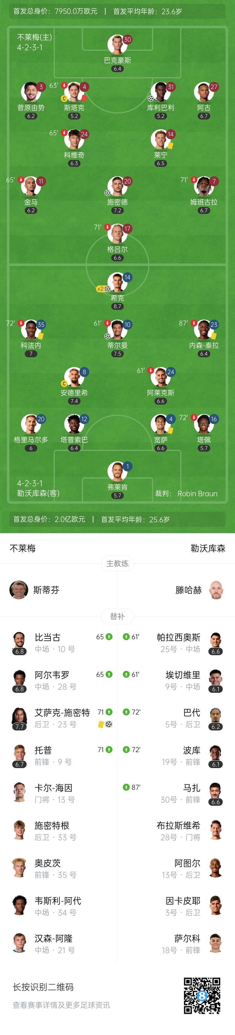 第76分钟,弗莱肯出击失误没碰到球,施密特面对空门将球轻松送进!2-3!少打一人的不莱梅追回一球!↓