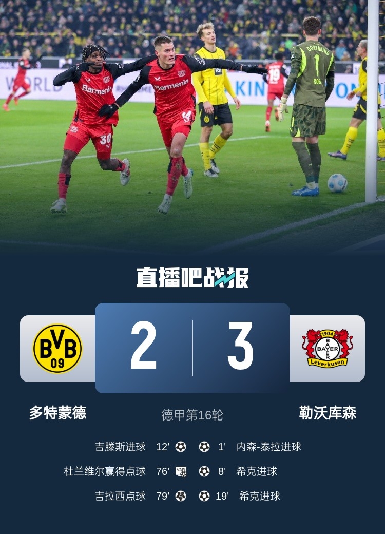 1月11日讯 德甲第16轮,多特坐镇主场伊杜纳信号公园球场对阵勒沃库森。上半场,泰拉开场24秒闪击,希克双响建功,吉滕斯进球。易边再战,希克错失戴帽良机,吉拉西点射建功。最终多特2-3勒沃库森。积分榜方面,勒沃库森先赛距榜首拜仁1分,多特25分第六。