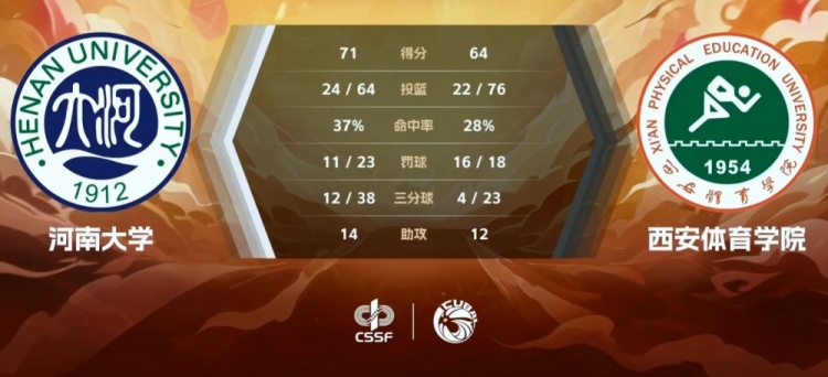 次节金鑫镇的三分帮助西安体院缩小分差,不过随后几波攻势都没能打成,河南大学则依靠陈辉煌的连投带罚及时稳住局面。上半场西安体院的拼抢表现其实要更好,整个上半场他们9次抢断制造对手13次失误,出手次数上也多出对手9次,但效率不高导致他们始终被动追分。河南大学末段依靠袁一宸和米卓的连续得分以38-33领先西安体院进入下半场。