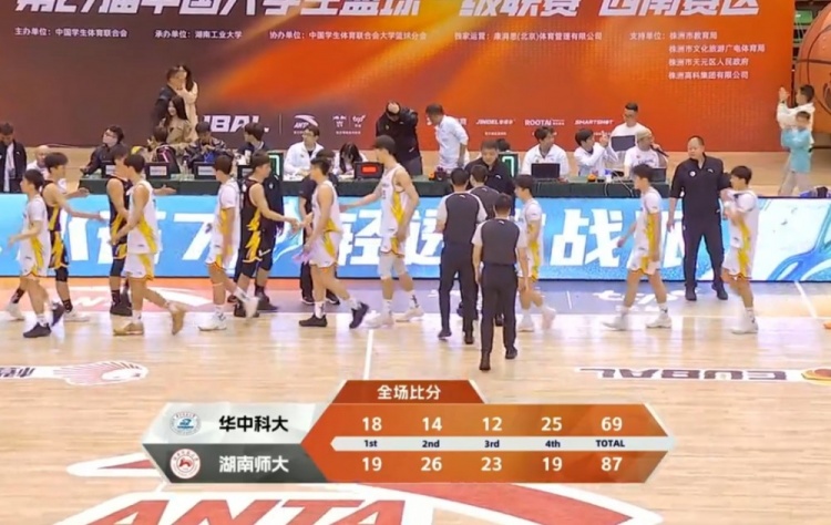 第四节,华中科大掀起反扑以12-0开局,还是常海鹏站出来三分命中为湖南师大打破3分钟的得分荒,此后湖南师大外线重拾手感又是三记三分命中,场上分差再度被拉大到20分,华中科大未能再组织起有效反扑。全场比赛结束,湖南师范大学87-69击败华中科技大学。