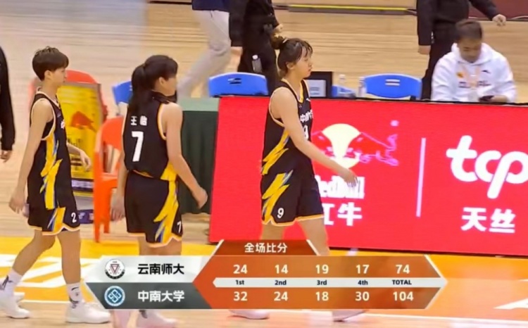 末节决战,高子淇和钟佳仪又是接连扔进三分,中南大学持续发力领先到20分以上。随后云南师大阻挡不了中南大学攻势,田媛媛外线接连扔进三分,中南大学一波小高潮直接拉开30分以上领先。随后双方开始换上替补练兵,最终中南大学104-74大胜云南师大。
