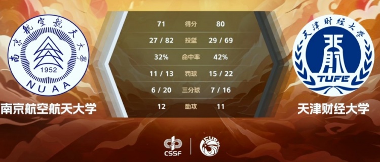 末节之争双方稳定输出都无法阻止对手,不过天津财大一直稳定拿分确保10分左右的优势。末段王佳颖和董齐双双命中三分追至7分,但此时时间所剩无几无力制造威胁。最终,天津财经大学80-71击败南京航空航天大学拿下比赛。