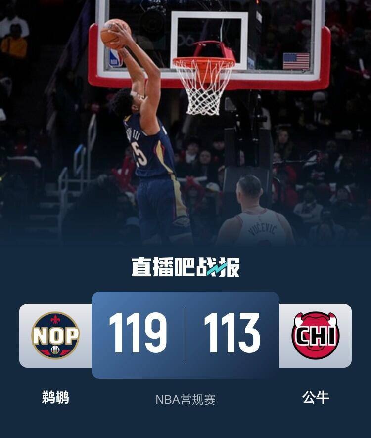 开场后武切维奇内外开花帮助公牛取得领先,鹈鹕多点开花紧追比分,锡安逐渐找到感觉连续上演暴扣。第二节上来墨菲连续拿分,两队依旧打得十分胶着,武切维奇在内线依旧相当高效帮助公牛在半场结束时保持领先。易边再战,墨菲手感不错接连砍分带领鹈鹕完成反超,拉文也找回状态用得分回应,两队陷入僵持,三节过后打成平手。末节决胜,鹈鹕靠着阿尔瓦拉多在外线的爆发建立起两位数优势,虽然最后鹈鹕连续失误,拉文接连砍分但为时已晚,最终鹈鹕119-113送给公牛2连败。