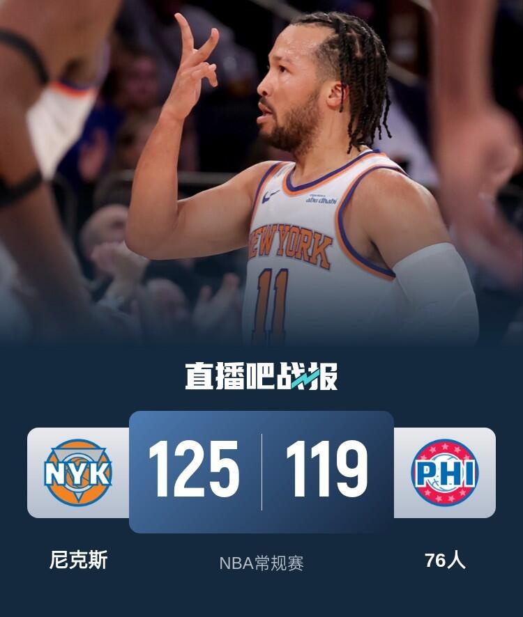 一开场,尼克斯率先发力,米卡尔-布里奇斯和布伦森联手带队取得领先,乔治连投带罚努力追赶,次节尼克斯率先发力扩大优势,76人利用防守反击缩小分差,尼克斯强攻内线连续拿分稳住局势,半场战罢尼克斯60-47领先尼克斯。下半场,76人展开反击,乔治内外开花带队迫近比分,道丁压哨打板三分将双方拉回同一起跑线,末节尼克斯占得先机取得微弱优势,76人连中三分扳平,关尼克斯内外开花确立优势,马克西连投带罚追赶,完成关键攻防将比赛拖入加时。加时赛,布伦森连投带罚拿到8分确立优势,76人苦苦追赶无果。最终,尼克斯加时125-119力克76人,客场过关。