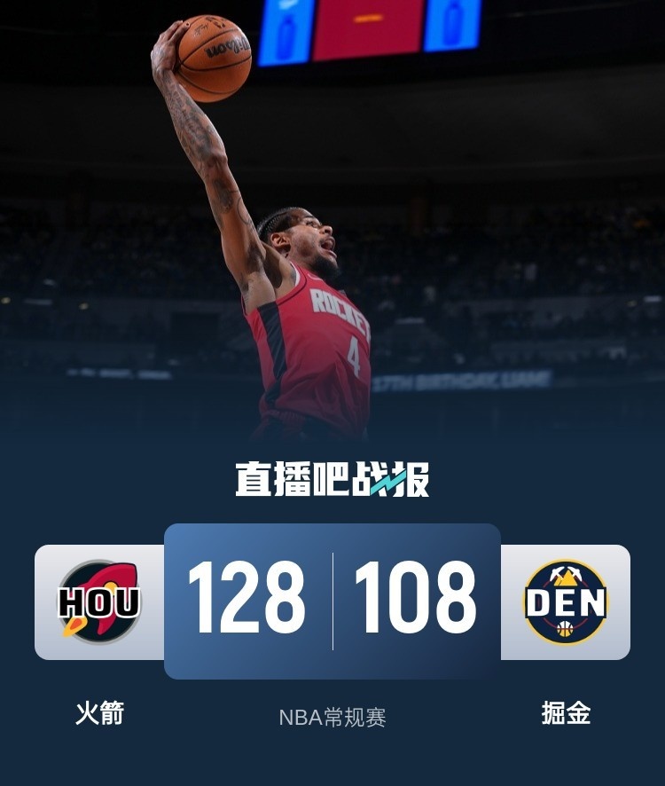 比赛开始,双方都迅速进入状态,火箭全民皆兵都有得分贡献,逐渐建立起主动权,威少连续失误被火箭反击,好在布劳恩能里突外投止血,首节火箭领先5分,次节杰伦-格林状态火热,他里突外投造杀伤弹无虚发轰下15分,火箭连续反击,外线多点开花半场直接拉开20分以上领先。下半场,穆雷联手威少带队追分,申京有攻有传内线连续取分回应,随后双方接连送炸裂暴扣秀,火箭还是能保持住20分以上领先,末节双方拉锯战,火箭还是牢牢掌握住20分以上领先,随后两队相继换上替补练兵,最终火箭128-108轻取掘金,终结对手4连胜同时拿到5连胜。