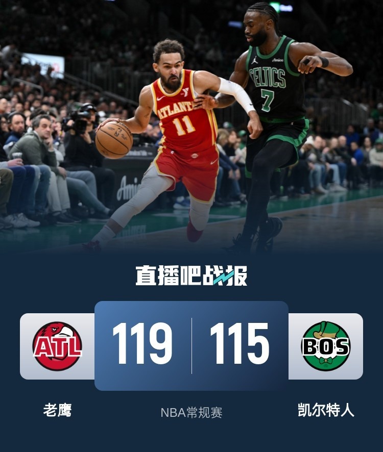 首节之争绿军早早进入状态,杰伦-布朗连砍9分帮助球队拿到19-9的完美开局,老鹰开局打得被动也直接导致随后一直被动追分;不过进入第二节双方剧本反转,首节打得被动的老鹰在开局轮换阶段送上15-6的攻势迅速追上比分,博格丹期间命中三分也将自己连续命中三分球场次扩大至111场;绿军方面则落入被动次节仅得15分并丢掉领先带着4分劣势进入下半场。休息归来老鹰状态如同过山车一般又开始回落,绿军则在落后9分的被动局面下送出18-4的攻势扭转局势;末节决胜时刻绿军虽然手握领先但优势不大埋下隐患,最后时刻塔图姆还投丢了关键罚球,特雷-杨则在随后两罚全中将比赛拖入加时。