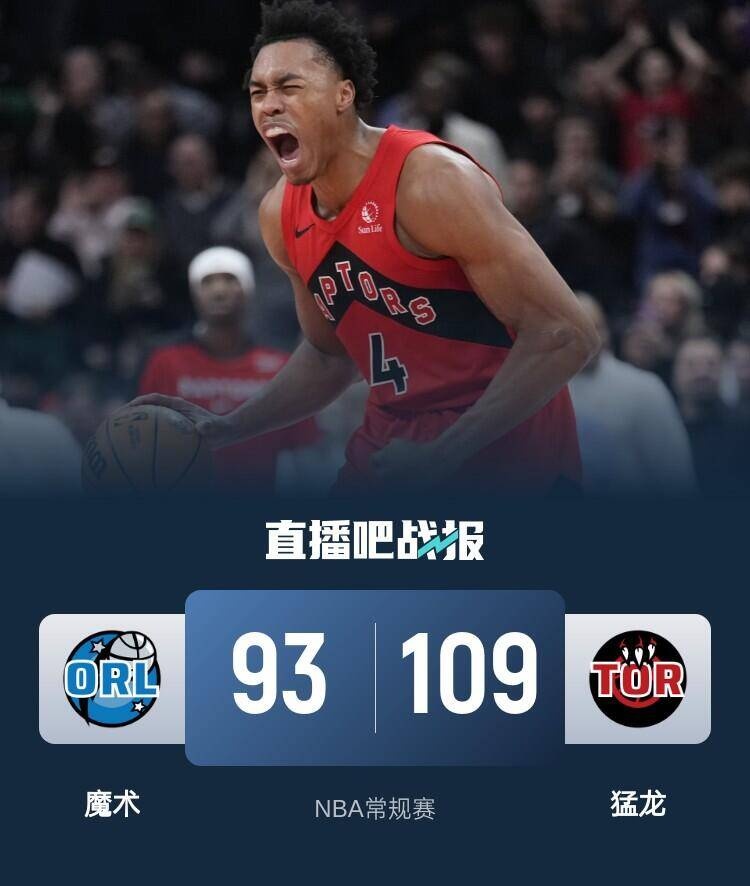 比赛刚上来猛龙就接连出现失误,魔术打出10-0的开局,随后他们多点开花一度将分差拉大到21分,布鲁斯-布朗站出来接连砍分帮猛龙稍微追回一些分数,他还在首节结束时命中压哨三分。第二节上来魔术失误增多,巴恩斯带领猛龙连续打出反击缩小分差,魔术在第二节中段一度找回节奏,但并没有能够保持很久,班凯罗压哨上篮打进帮助魔术半场艰难守住5分优势。易边再战,魔术依旧打得十分艰难,猛龙外线找到手感不断下起三分雨,迪克还上演隔人劈扣的精彩表现,猛龙单节打出40-20的比分完成反超。末节魔术依旧主要靠班凯罗和波普拿分,猛龙还是多点开花保持流畅进攻,场上分差被拉大到20分开外,比赛失去悬念,最终猛龙109-93逆转送魔术4连败。