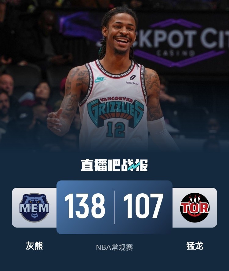 🏀小杰克逊32+5 莫兰特26+5 灰熊25个前场板大胜猛龙近11战10胜