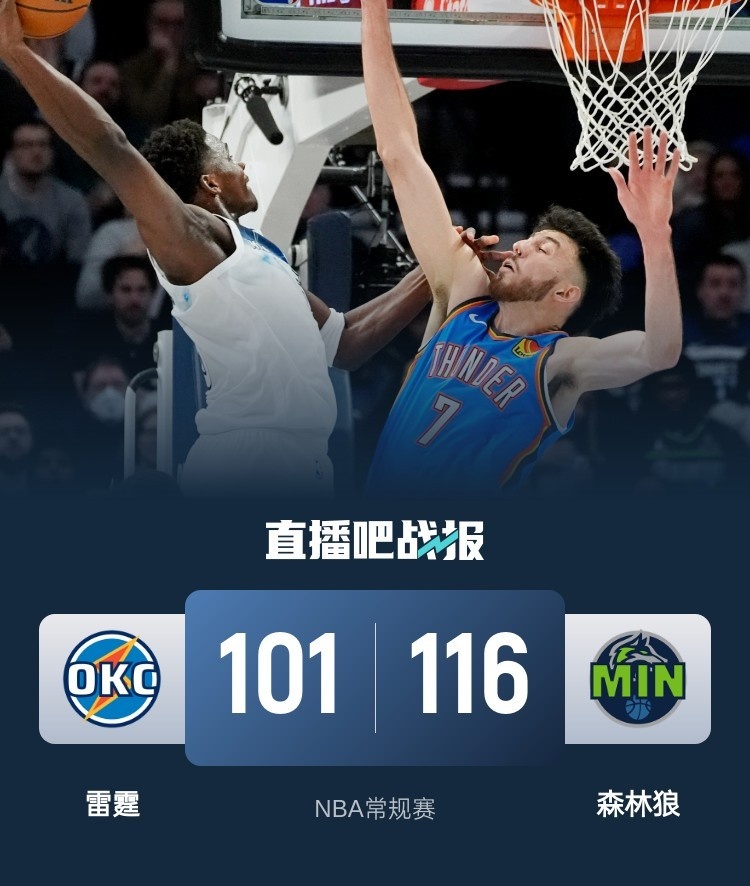 比赛开始,亚历山大不中状态连续打铁,雷霆进攻端也受阻,而森林狼则是活力十足,爱德华兹送暴力隔扣,香农也成为奇兵,首节森林狼领先13分,次节双方展开拉锯战,杰伦威接连突破单节上双带队追分,但里德能给出回应,香农压哨勾手命中助森林狼半场还领先8分。第三节,雷霆上来就接连攻击内线一度反超比分,但沃克和里德、爱德华兹接连4记三分轰出12-0攻击波强势回应,随后双方拉锯战三节森林狼还领先10分,末节森林狼接连攻击内线一波10-2再次拉开比分,随后森林狼牢牢保持住十几分领先,双方换上替补练兵,最终森林狼116-101力克雷霆,终结对手7连胜。