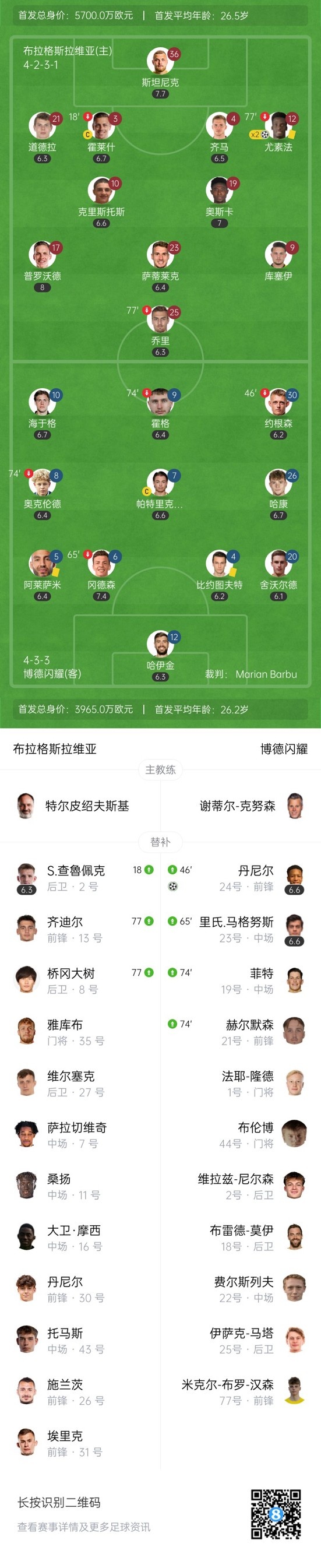 下半场补时7分钟,布拉格斯拉维亚2-2博德闪耀。