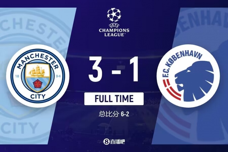 全场比赛结束,最终曼城3-1哥本哈根。