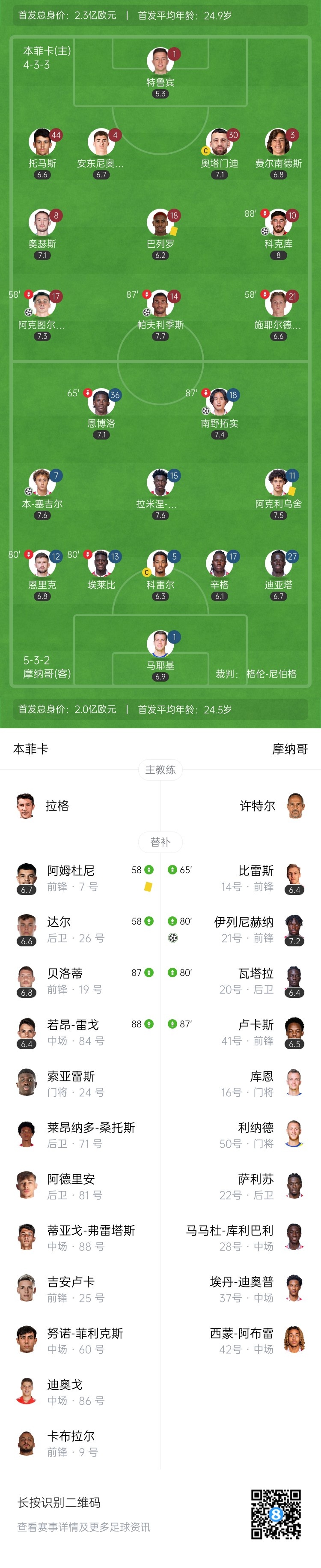 下半场补时7分钟。最终全场比赛结束,本菲卡总比分4-3淘汰摩纳哥晋级欧冠16强。