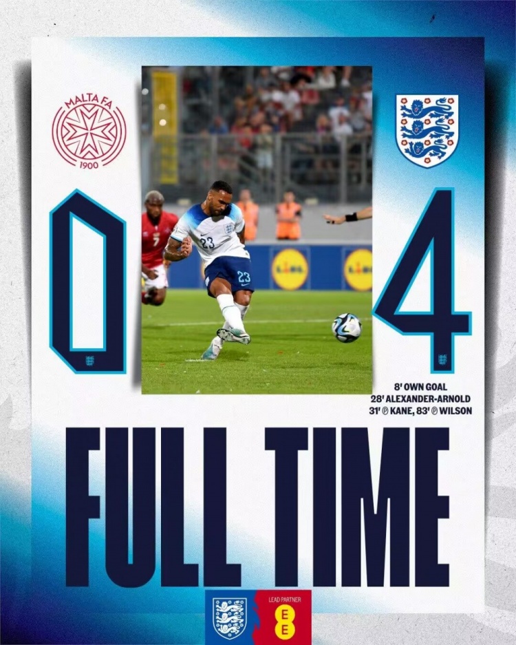 6月17日讯 北京时间6月17日02:45,欧洲杯预选赛C组第3轮英格兰客场挑战马耳他的比赛,上半场萨卡造乌龙,阿诺德世界波,凯恩点射,下半场威尔逊点射建功,最终英格兰客场4-0大胜马耳他三连胜继续占据C组榜首。