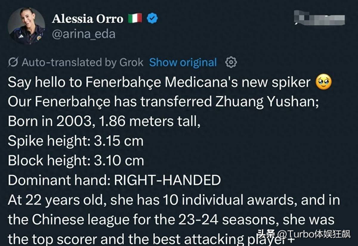 根据欧洲媒体的最新消息,庄宇珊这次有望和袁心玥一起加盟土耳其的费内巴切女排。 虽然俱乐部还没有正式公布球员名字,但外界普遍猜测是她们两人。 土耳其媒体已经放出了风声,晒出了庄宇珊的资料。