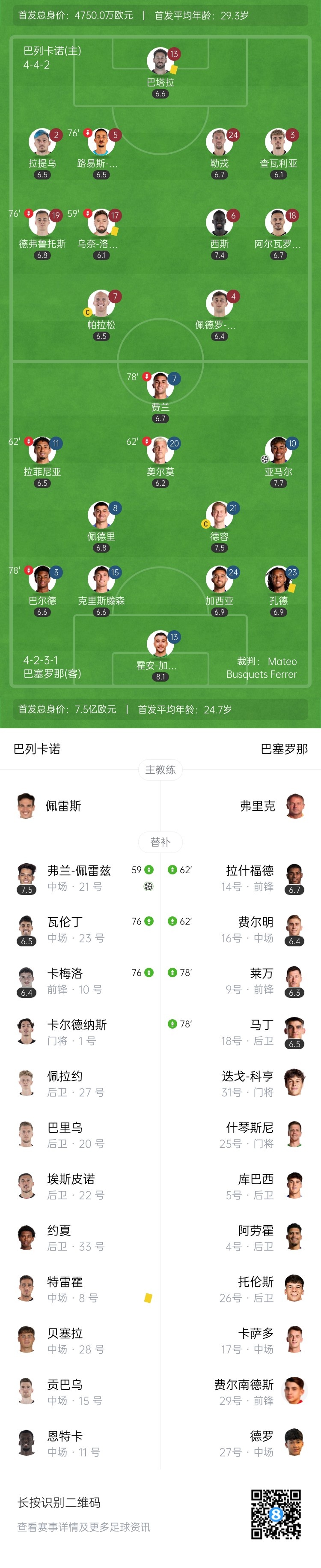 第67分钟,帕拉松主罚巴列卡诺右侧角球开到后点,巴萨防守完全漏人,刚刚替补登场的弗兰-佩雷斯轻松凌空垫射入网,巴列卡诺1-1扳平比分↓
