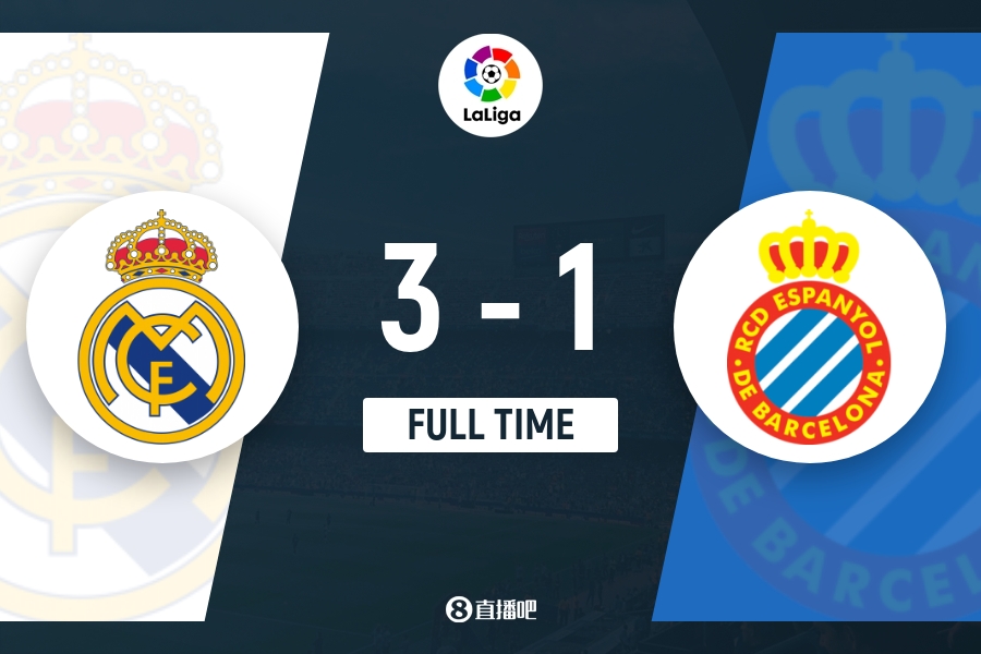 全场比赛结束,皇家马德里3-1西班牙人。