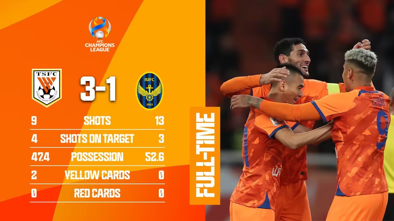 全场比赛结束,山东泰山3-1击败仁川联。