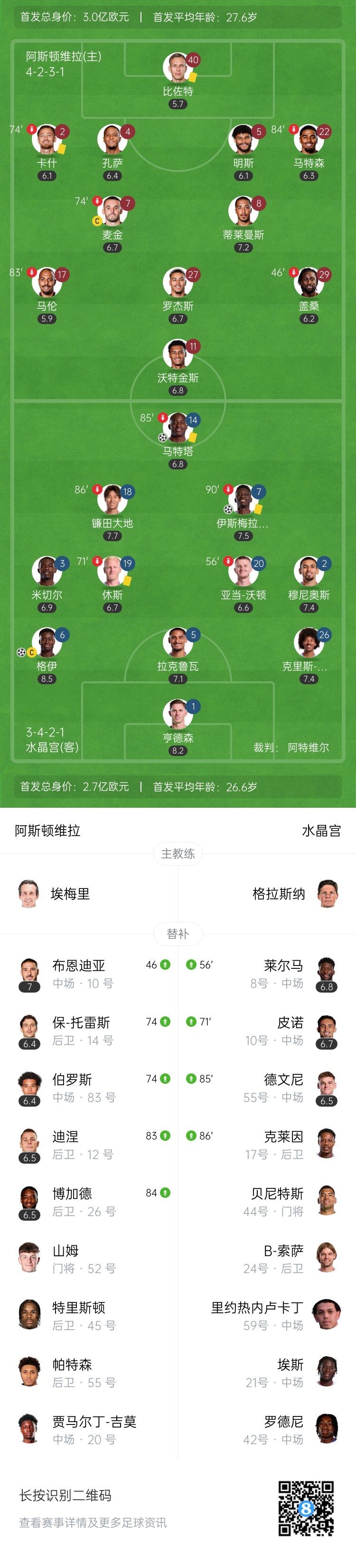 3场0进球!维拉0-3惨败水晶宫 格伊世界波马特塔点射大马丁缺战