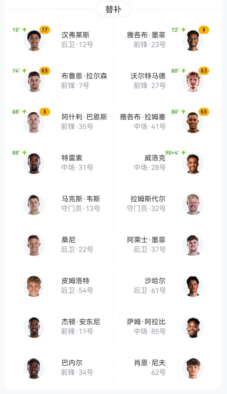 第7分钟,纽卡前场右路连续的短传配合,禁区右侧巴恩斯的打门被门将扑出,门前乱战吉马良斯和维萨双鬼拍门,最终由维萨补射入网,纽卡2-0领先↓