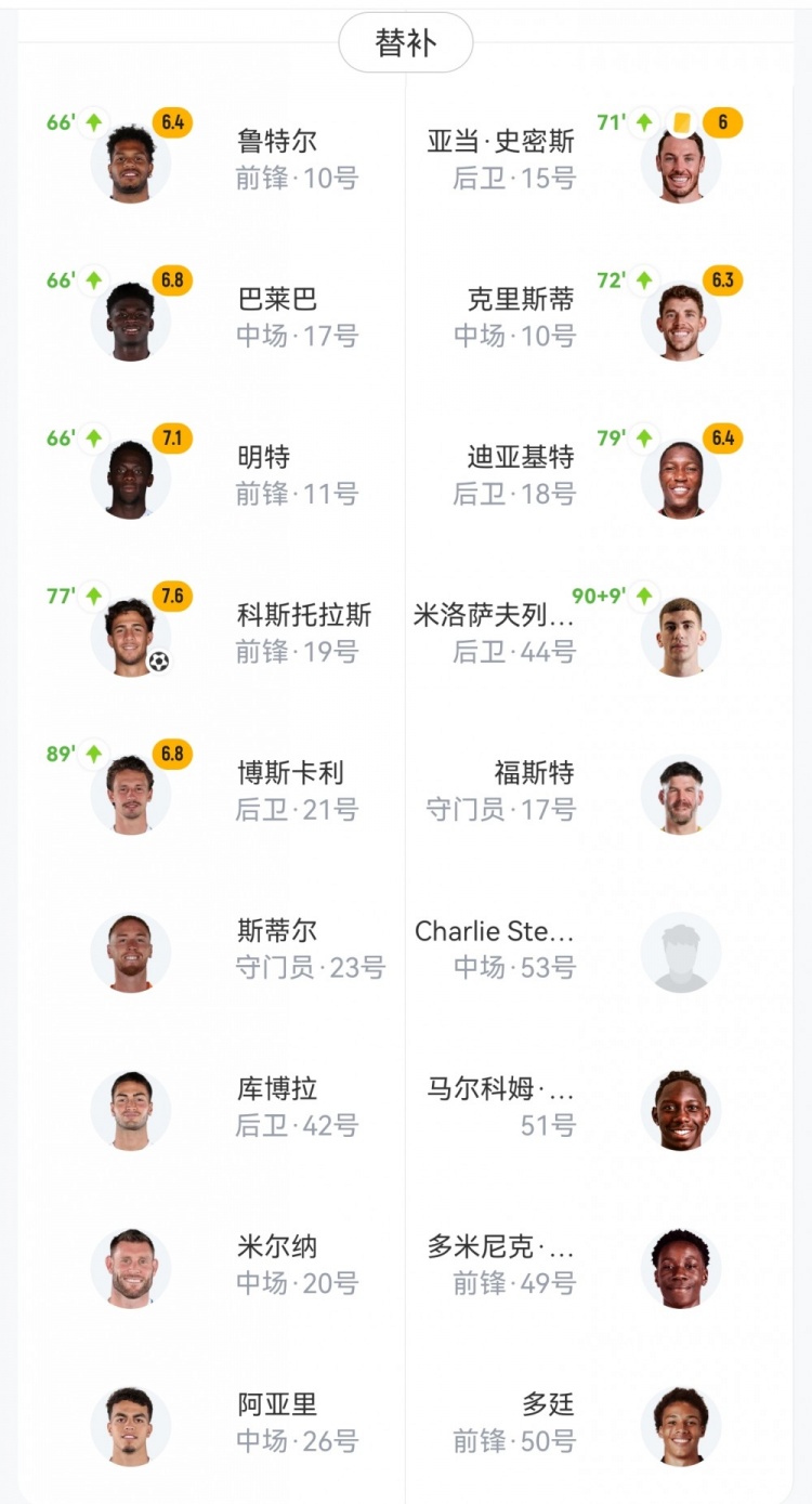第90+1分钟,布莱顿左肋位置传中到禁区,范赫克头球摆渡,点球点附近科斯托拉斯倒钩破门!!!布莱顿1-1扳平↓