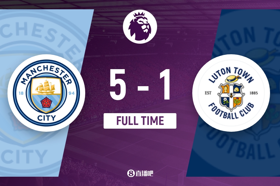 全场比赛结束,曼城5-1卢顿。