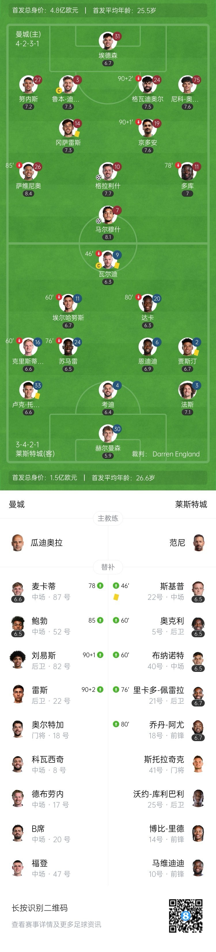 全场比赛结束,曼城2-0莱斯特城。