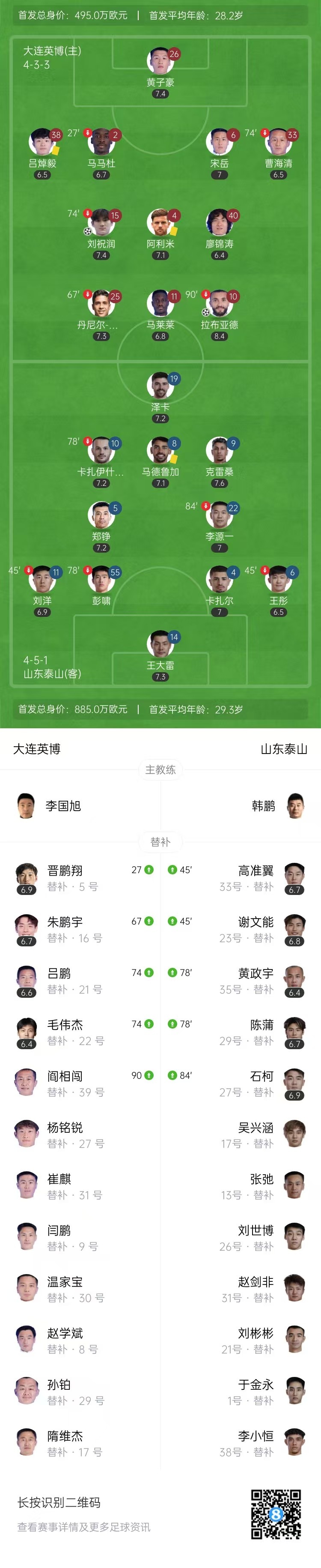 第35分钟,刘祝润内切突然起脚打门,皮球有个弹地后飞进球门远角,大连英博1-0山东泰山。↓