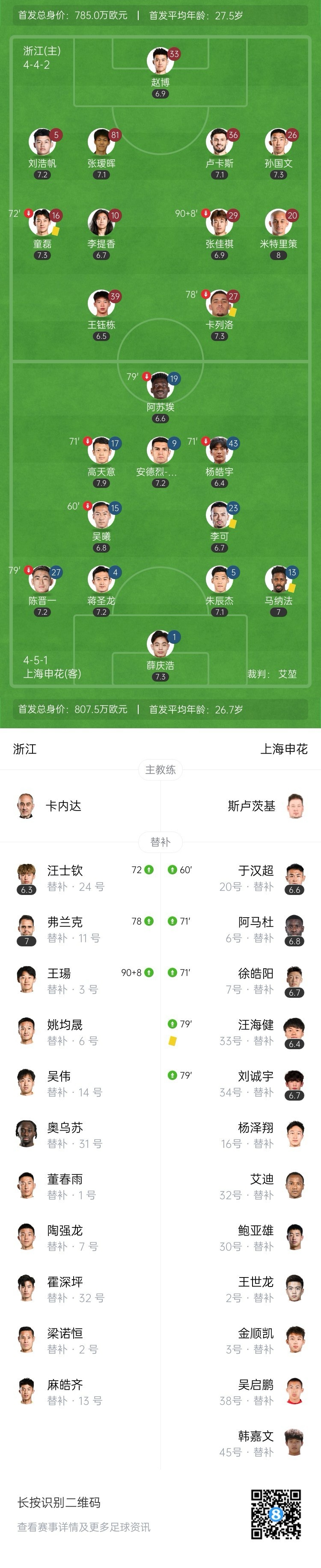 全场比赛结束,浙江主场0-0战平上海申花。