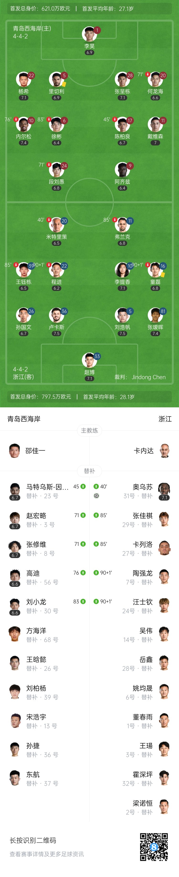 下半场补时6分钟。最终全场比赛结束,青岛西海岸0-2浙江队。