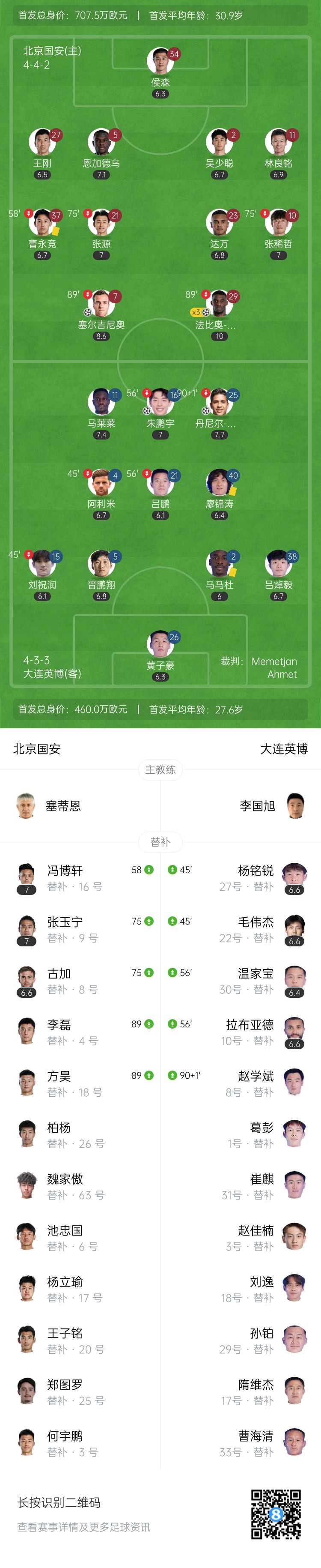 下半场补时7分钟。最终全场比赛结束,北京国安4-2大连英博。