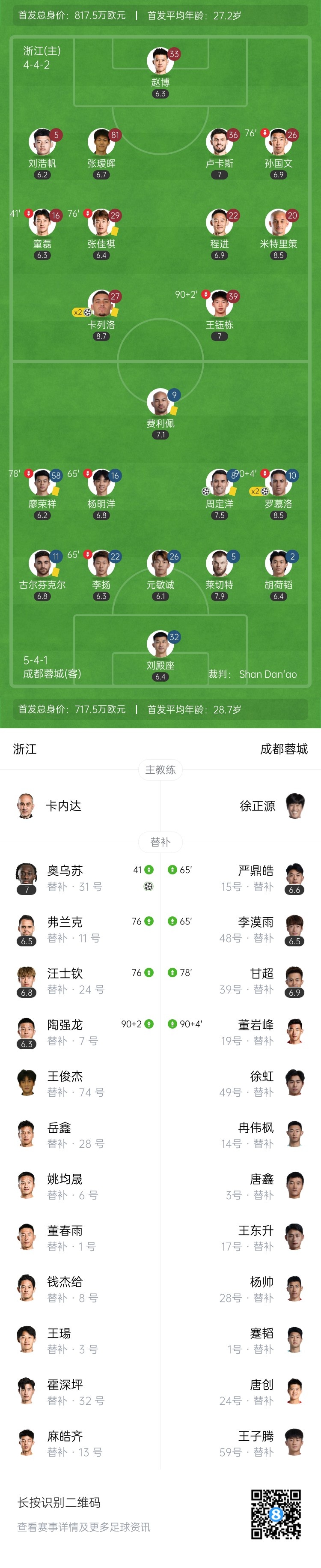 第90+10分钟,米特里策直塞助攻,卡列洛禁区内左侧左脚抽射近角破门!浙江队连扳三球,3-3绝平成都蓉城↓