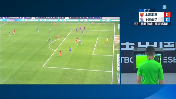 第25分钟,奥斯卡左侧传中送到后点,武磊头球顶回禁区,最终后插上的王振澳一脚低射打在蒋圣龙身上折射出底线,随后VAR长时间介入傅明亲自观看回放,先后回放了巴尔加斯禁区内倒地、武磊头球回做造成杨泽翔疑似手球等画面,最终傅明判定海港队员李帅越位在先↓