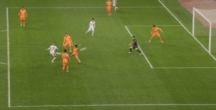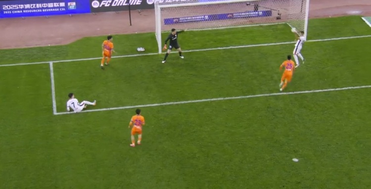 第77分钟,古尔芬克尔中场带球长驱直入杀入禁区,赵剑非关键倒地将球解围出底线。↓