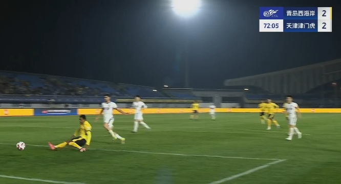 全场比赛结束,天津津门虎客场2-2战平青岛西海岸。