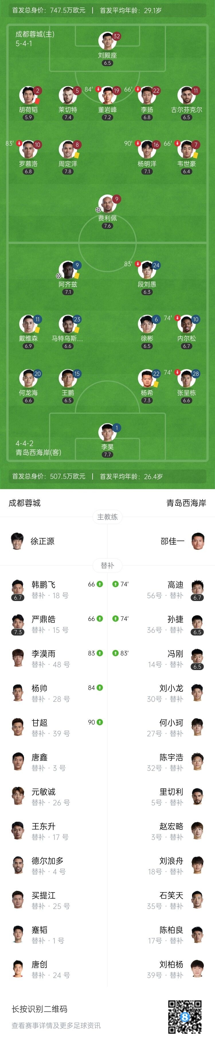 伤停补时5分钟。全场比赛结束,成都蓉城1-1青岛西海岸。