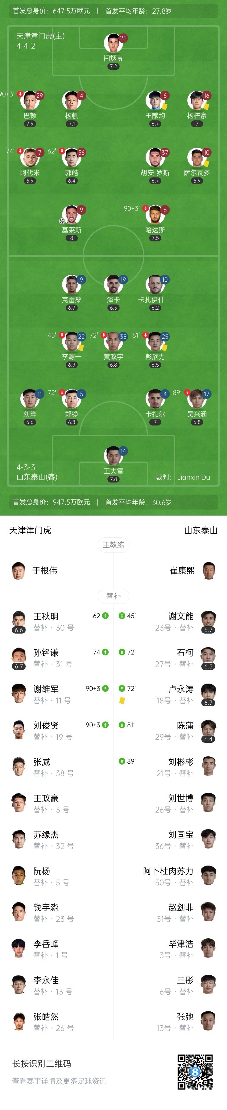 五六名互换!津门虎1-0泰山 王大雷扑点难救主基莱斯破门刘洋送点