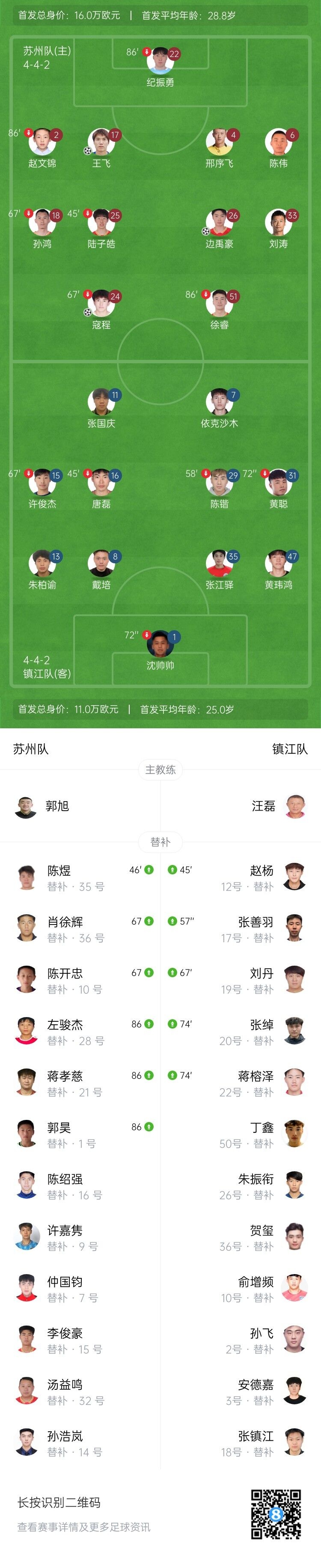 伤停补时2分钟。全场比赛结束,苏州4-0镇江。