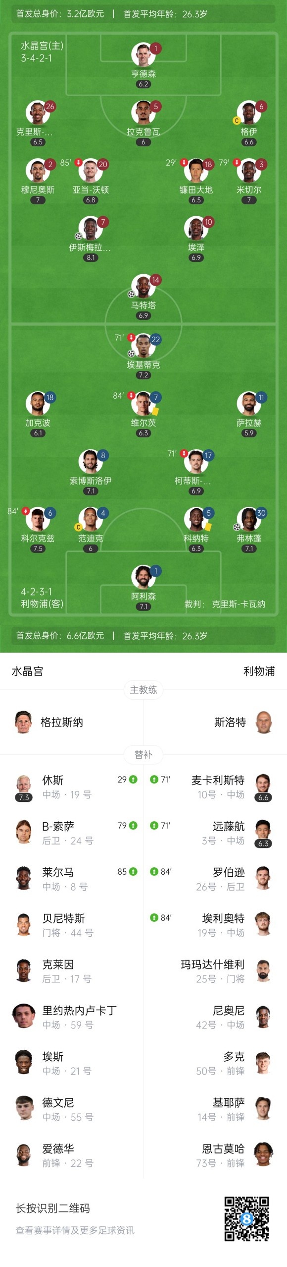 半场结束,水晶宫1-2利物浦。
