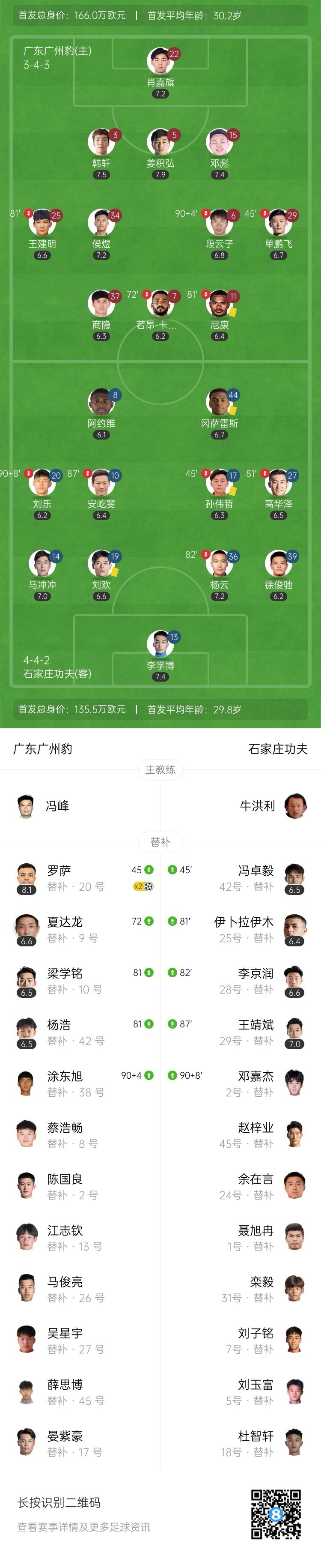 广州豹2-0石家庄功夫先赛距冲超区6分 罗萨替补双响+任意球破门