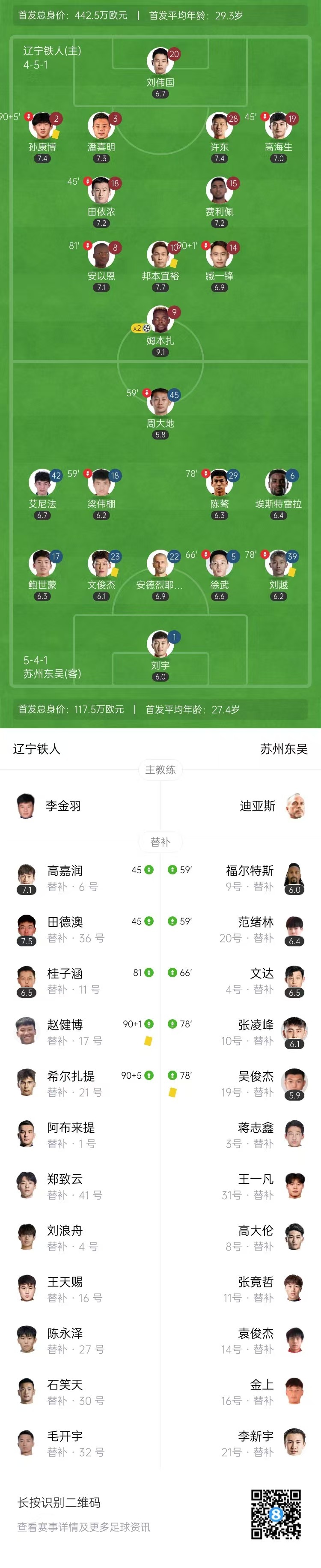 第86分钟,辽宁铁人前场左侧任意球开入禁区,姆本扎点球点附近头球破门,辽宁铁人2-0苏州东吴。↓