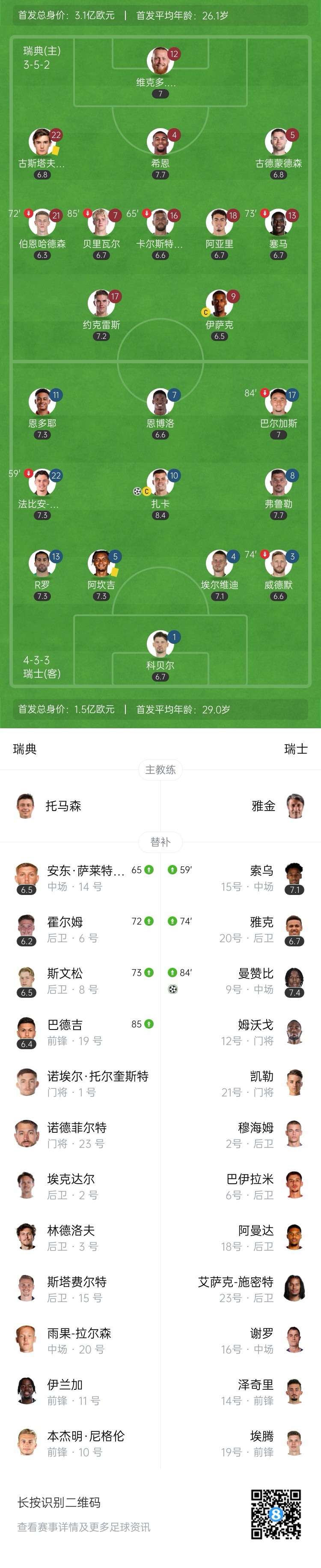 出线危!瑞典0-2不敌瑞士遭三场不胜小组垫底 伊萨克约克雷斯哑火