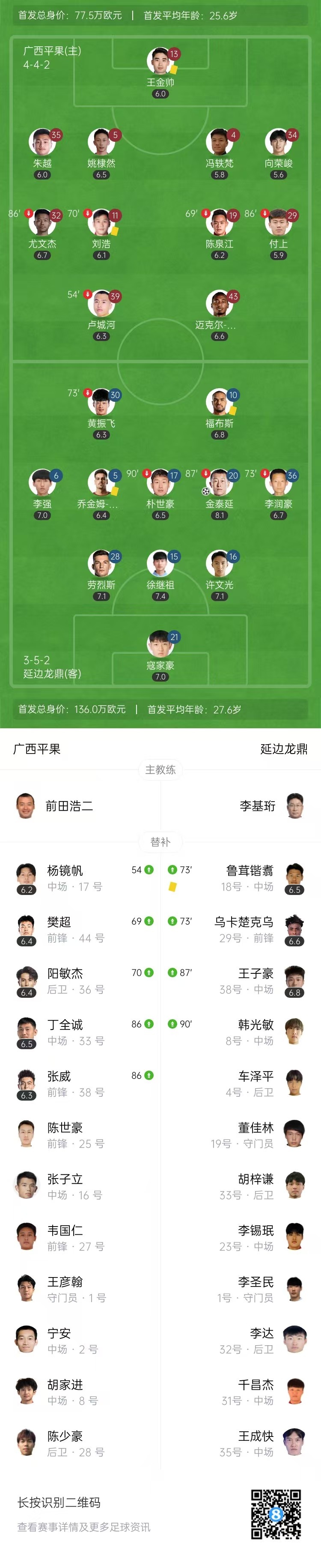 第79分钟,延边左路传中,金泰延后点头球打破僵局,延边龙鼎1-0广西平果。↓