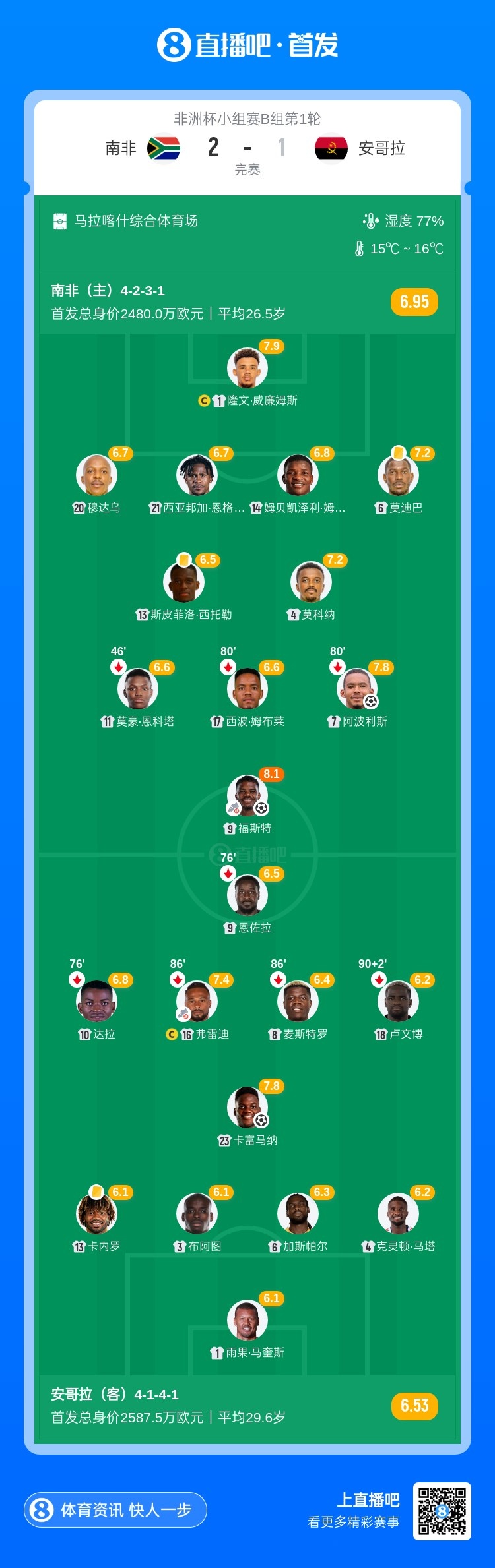 非洲杯-南非2-1安哥拉迎开门红 福斯特传射莫雷米助攻+进球被吹