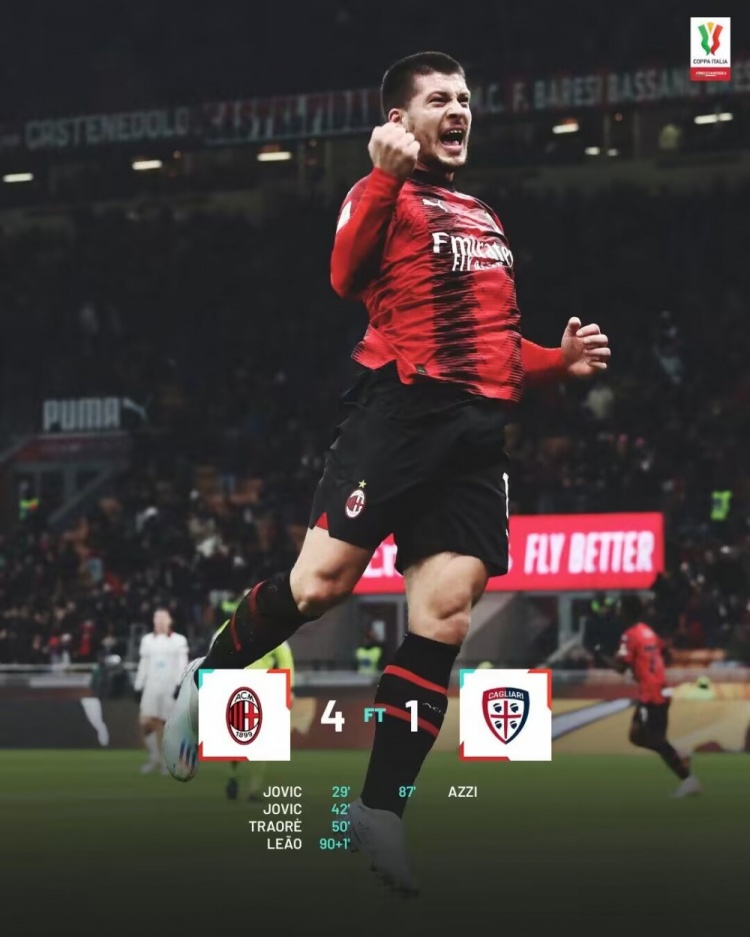 意杯-米兰4-1卡利亚里晋级八强 约维奇梅开二度特奥助攻双响