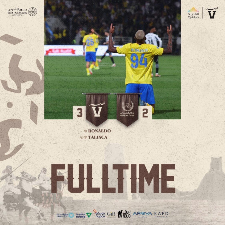 利雅得胜利首发:33-阿卜杜拉、78-奥贾米(76'14-纳吉)、5-阿姆里、27-拉波尔特、15-特莱斯、17-哈巴利、25-奥塔维奥(76'12-纳瓦夫)、77-布罗佐维奇、94-塔利斯卡、10-马内(83'23-叶海亚)、7-C罗