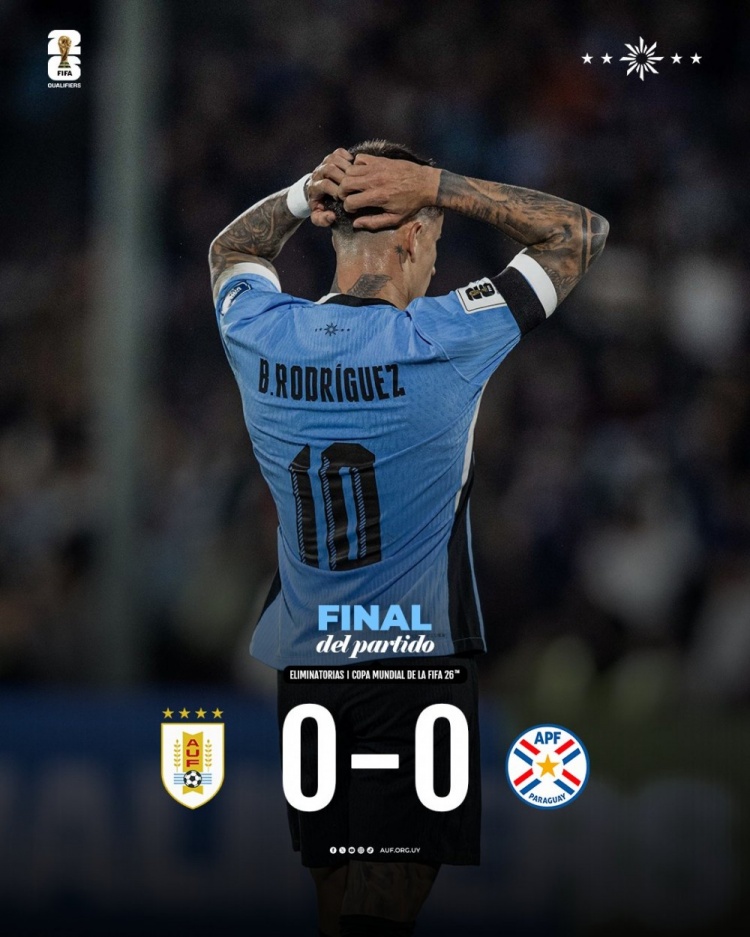 9月7日讯 北京时间9月7日早上7:30,世预赛南美区第7轮,乌拉圭主场迎战巴拉圭,此役也是苏亚雷斯的国家队告别战。上半场,恩西索中框,苏亚雷斯写意凌空斩中柱。下半场,戈麦斯兜射中框,苏亚雷斯替队友出头染黄。全场结束,乌拉圭0-0巴拉圭。本场过后,乌拉圭4胜2平1负积14分继续排名第2,巴拉圭1胜3平3负积6分排名第7。