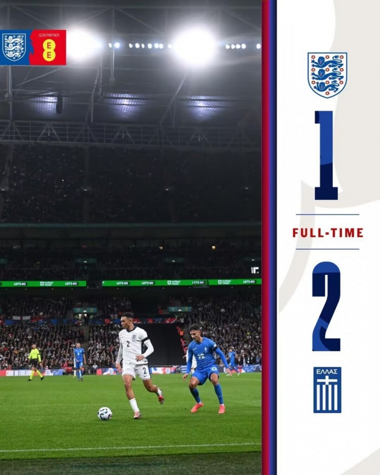 新帅首败!英格兰1-2希腊 贝林厄姆远射扳平希腊三球被吹