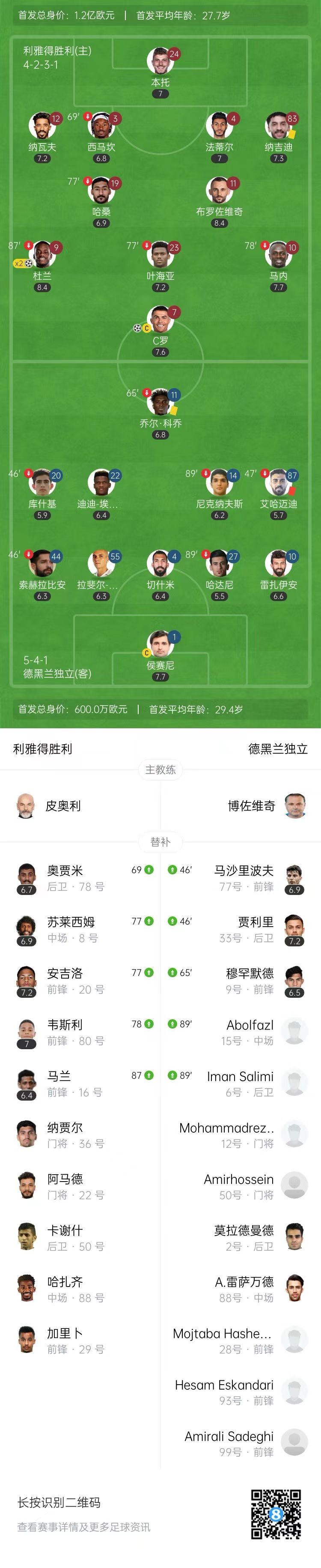 3月11日讯 北京时间3月11日2:00,亚冠精英联赛西亚区1/8决赛次回合,利雅得胜利坐镇姆尔索尔公园球场迎战德黑兰独立。上半场,杜兰吊射破门,马内造点,C罗点射扩大比分,艾哈迈迪两黄变一红被罚下。下半场,哈桑远射击中横梁,杜兰反击破门完成双响。全场比赛结束,利雅得胜利两回合3-0击败德黑兰独立,晋级八强。
