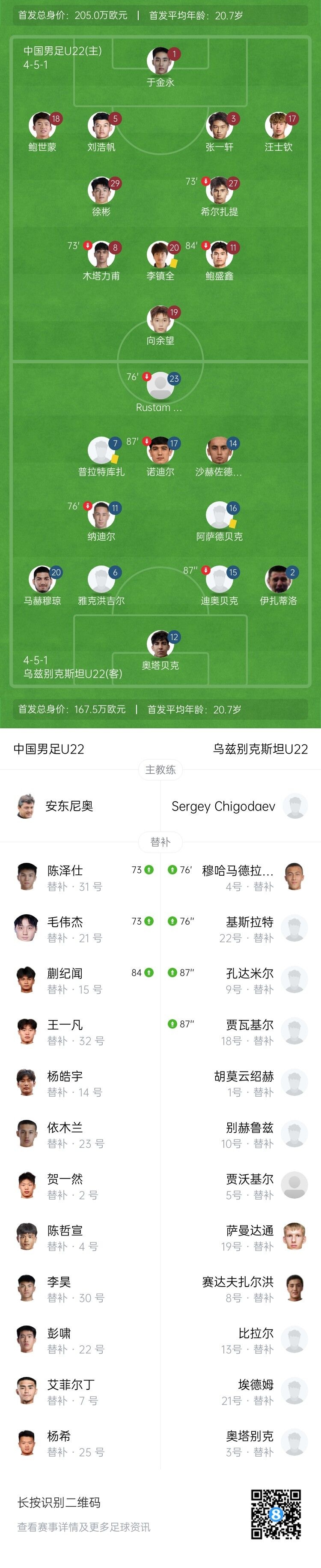 伤停补时5分钟。全场比赛结束,中国U22以0-0乌兹别克斯坦U22。
